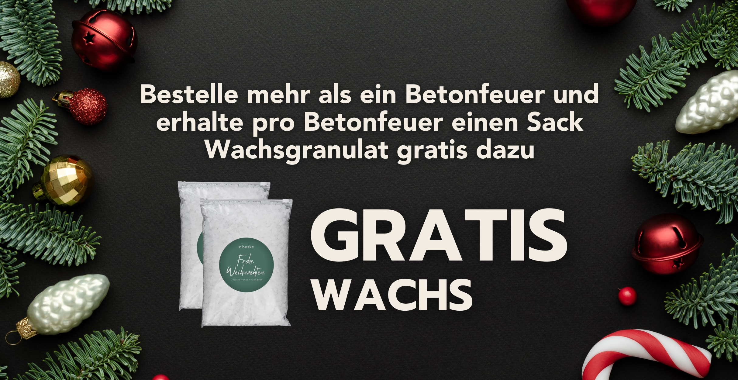 Kaufe zwei Betonfeuer und erhalte das Wachsgranulat zum schnellen und unkomplizierten Nachfüllen gratis dazu. So hast Du in der Weihnachtszeit eine Sorge weniger und kannst die warmen Flammen ganz entspannt genießen – bis sich über die Feiertage wieder genug Wachsreste zum Nachfüllen gesammelt haben.