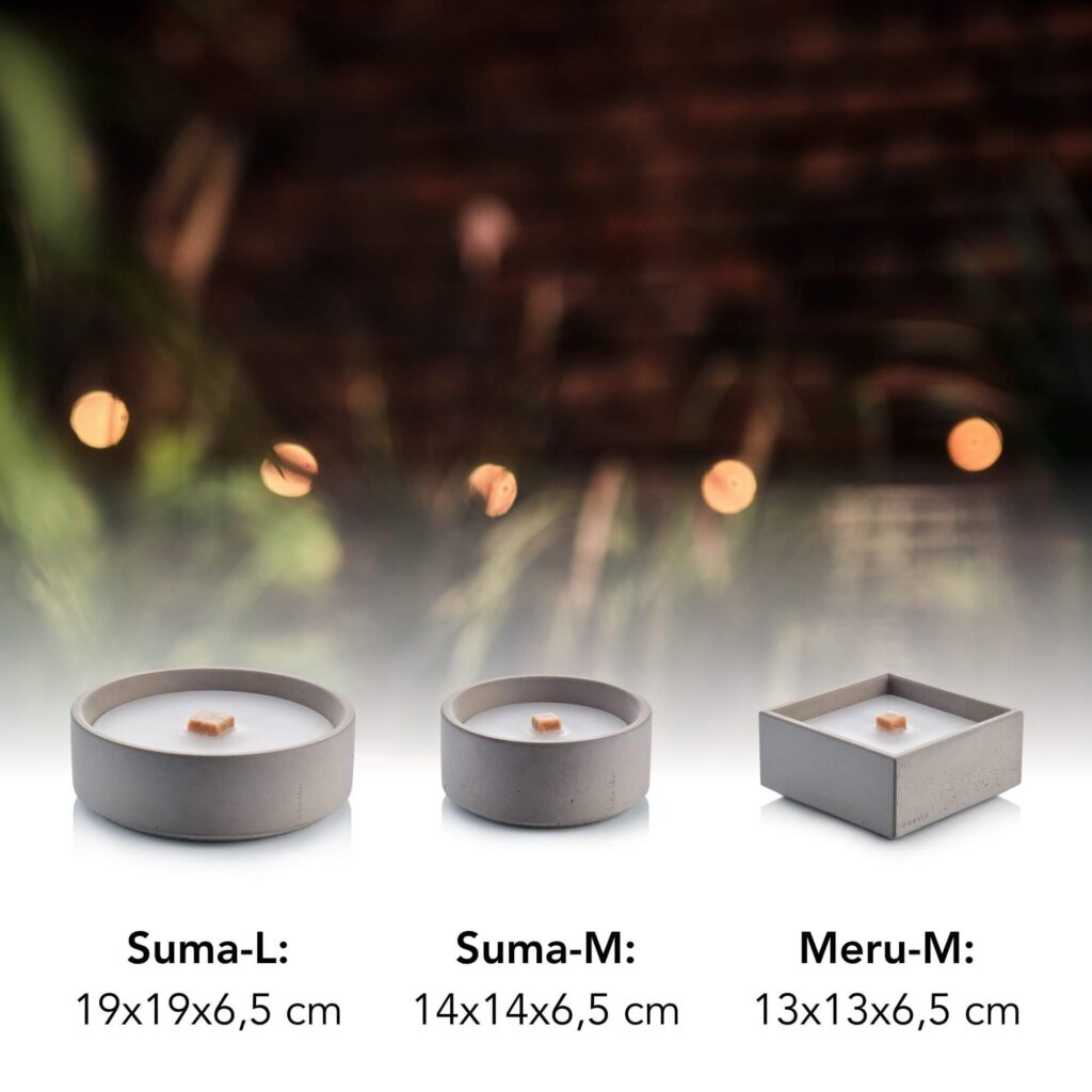 Neue Formsprache – neues Glück! Die Kollektion der vier neuen Betonfeuer ist filigraner, flacher und trotz allem Teil der Familie der Betonfeuer. Egal ob rund oder rechteckig – die Wachsfresser aus feinporigem Beton verwerten Deine Kerzenreste und verwandelt Wachsreste in schöne Stunden. Dank Dauerdocht kannst Du ‚Suma‘ und ‚Meru‘ in beiden Größen langfristig auf Deiner Terrasse genießen.